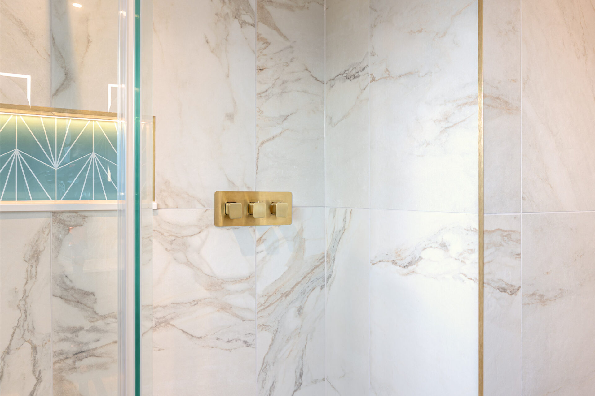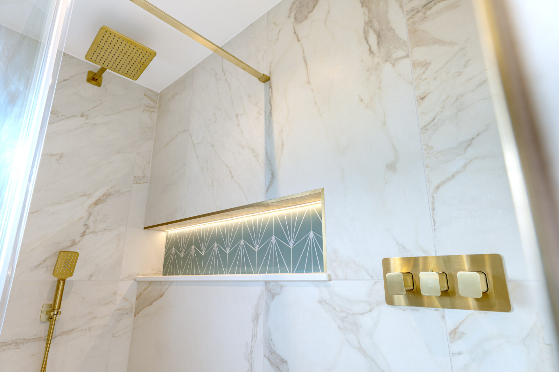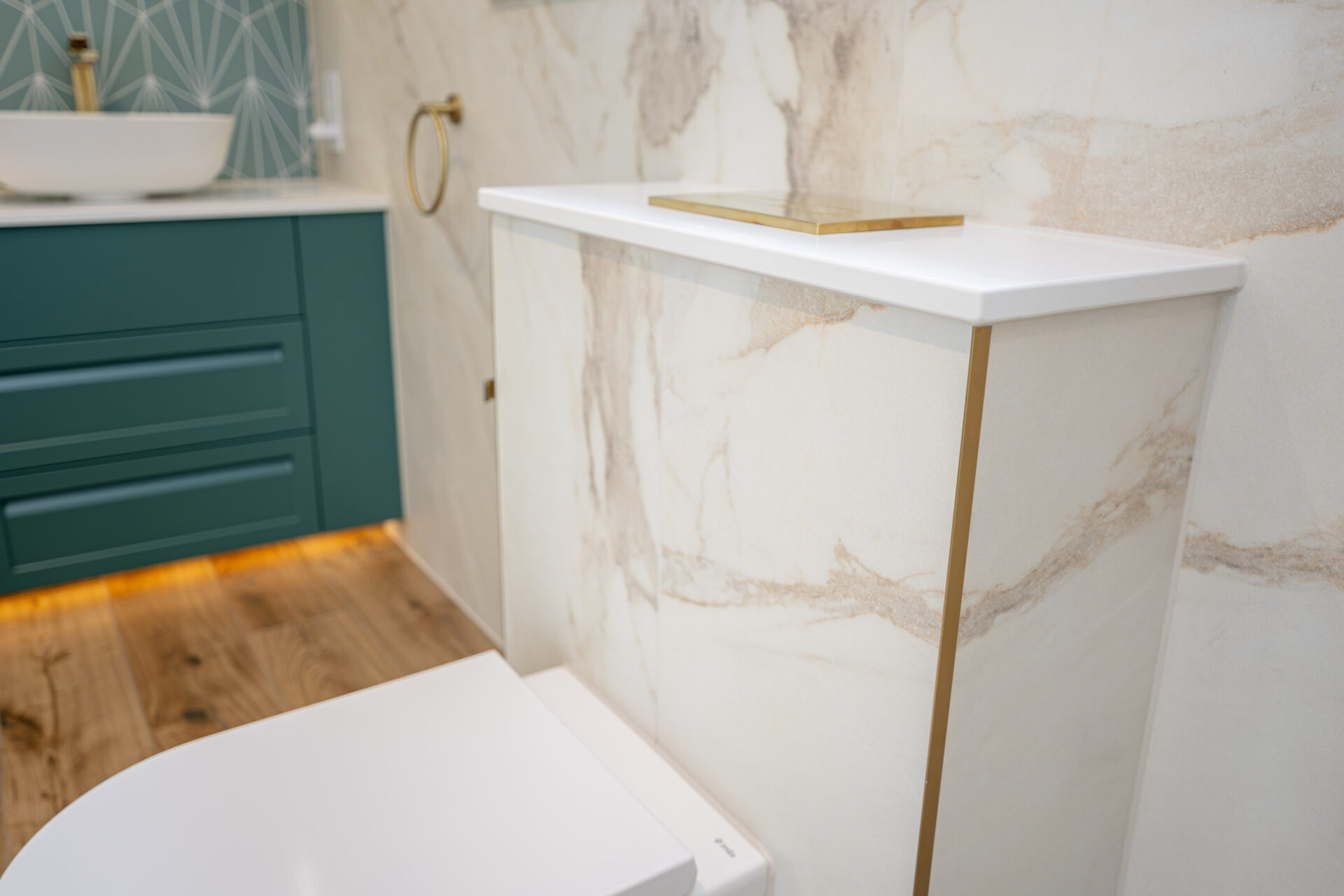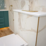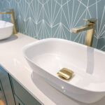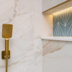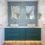 This luxury bathroom project in Cuckfield showcases a perfect blend of modern design, high-end materials, and practical functionality. The bespoke teal double vanity unit creates a striking focal point, complemented by a stylish geometric feature wall and elegant marble-effect panels.