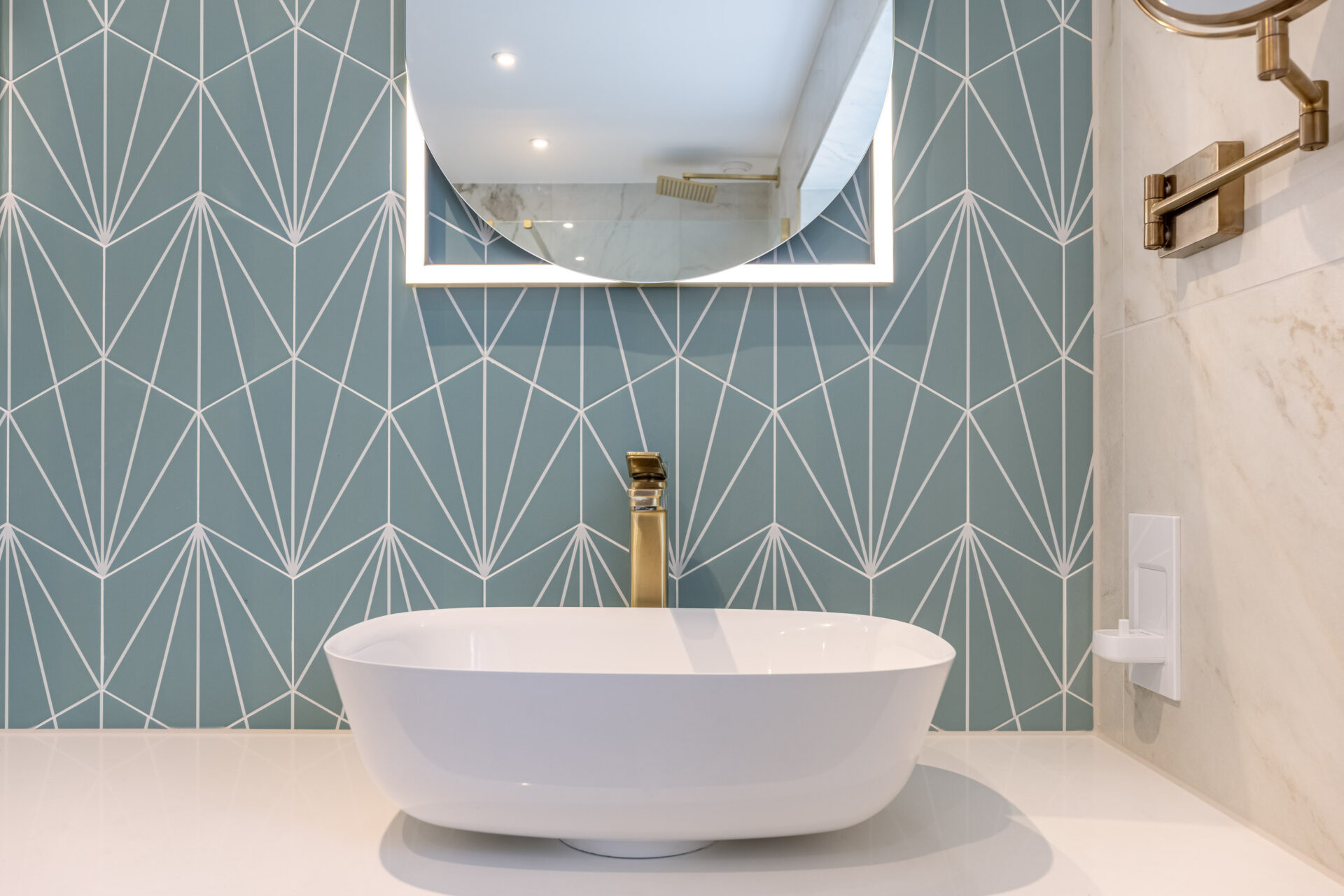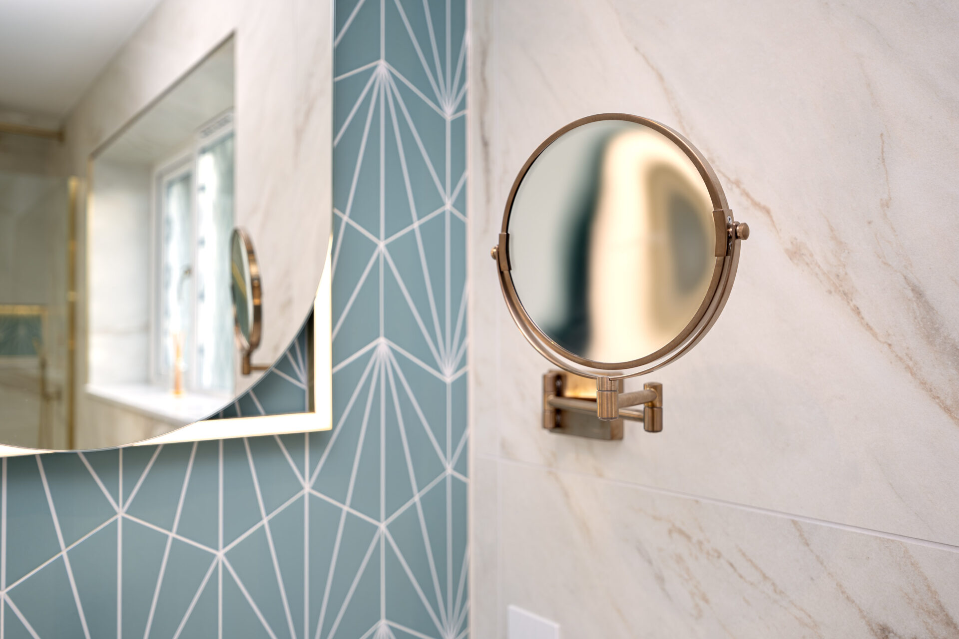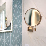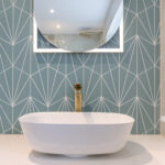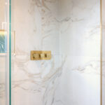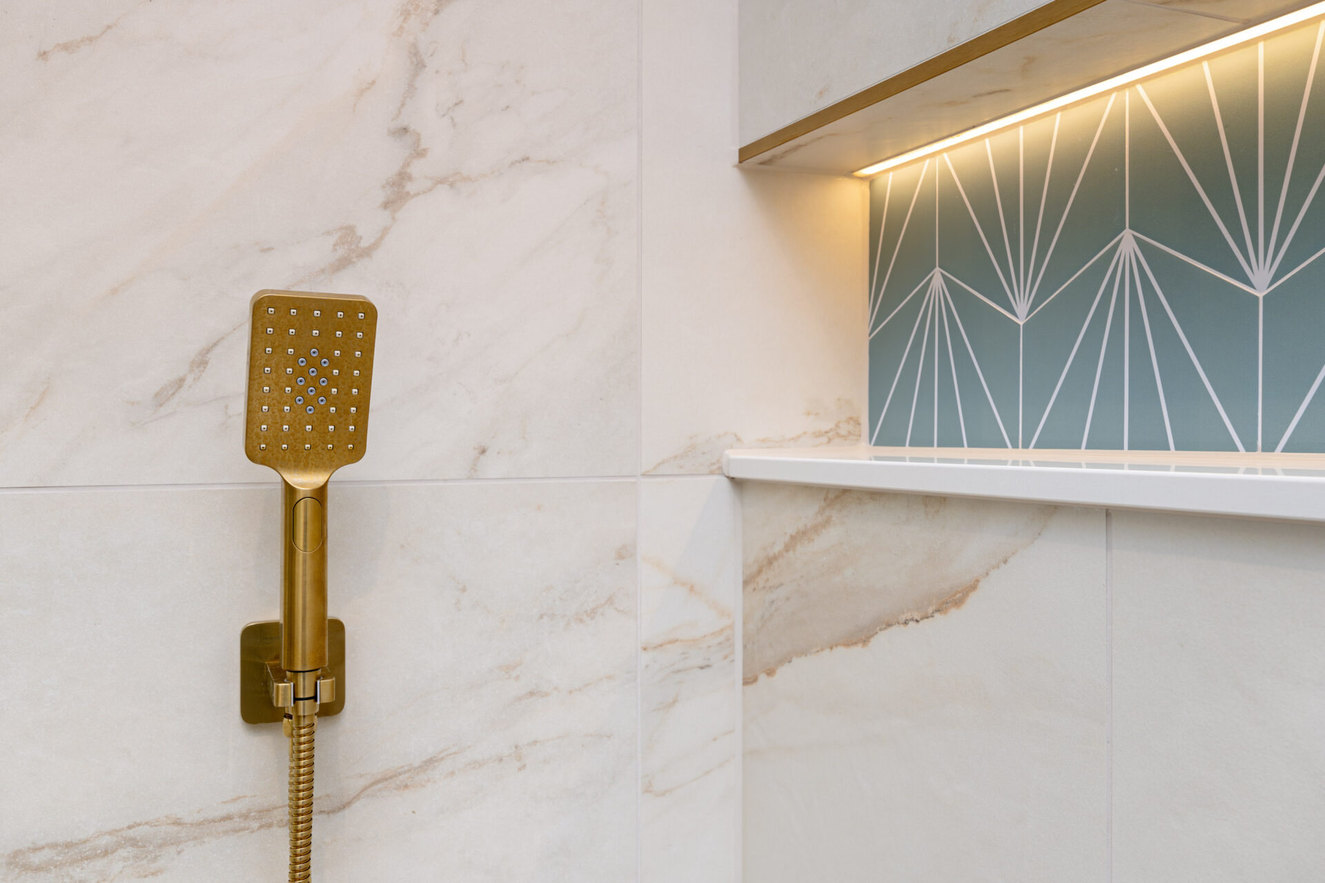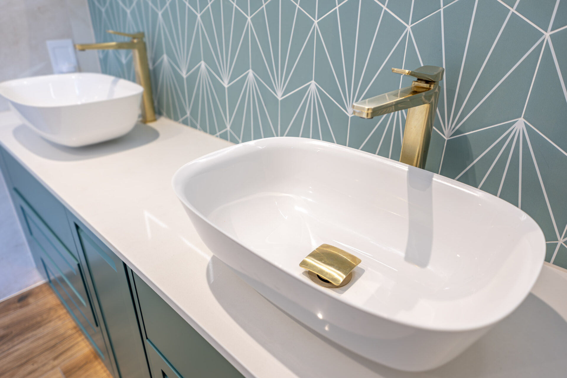 This luxury bathroom project in Cuckfield showcases a perfect blend of modern design, high-end materials, and practical functionality. The bespoke teal double vanity unit creates a striking focal point, complemented by a stylish geometric feature wall and elegant marble-effect panels.