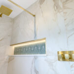 Designed for both style and convenience, the double basin layout is ideal for shared use, while the floating vanity provides generous storage and enhances the sense of space. Brushed brass fixtures, including the taps and heated towel rail, add a premium finish that elevates the overall design.