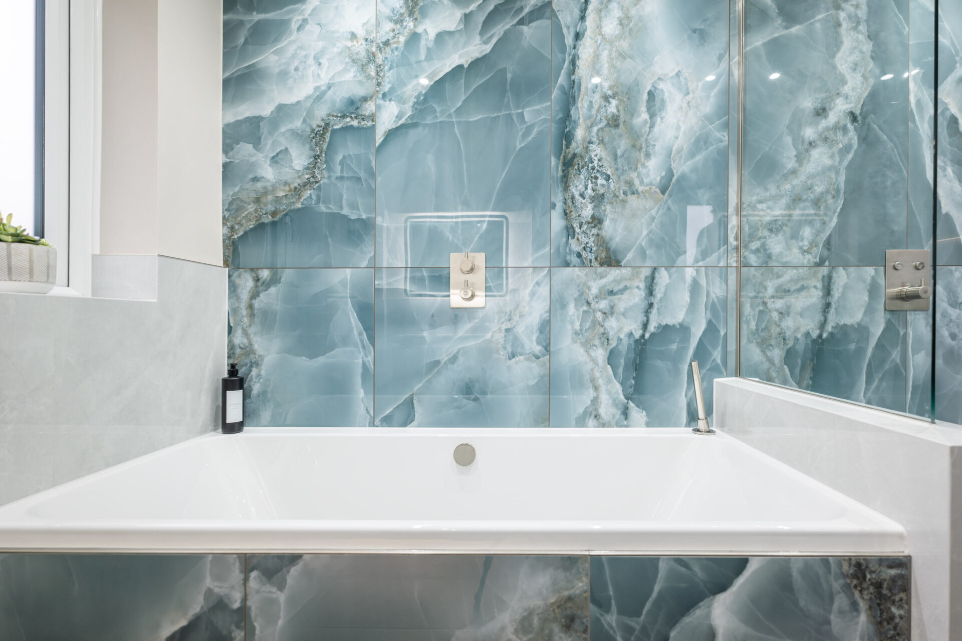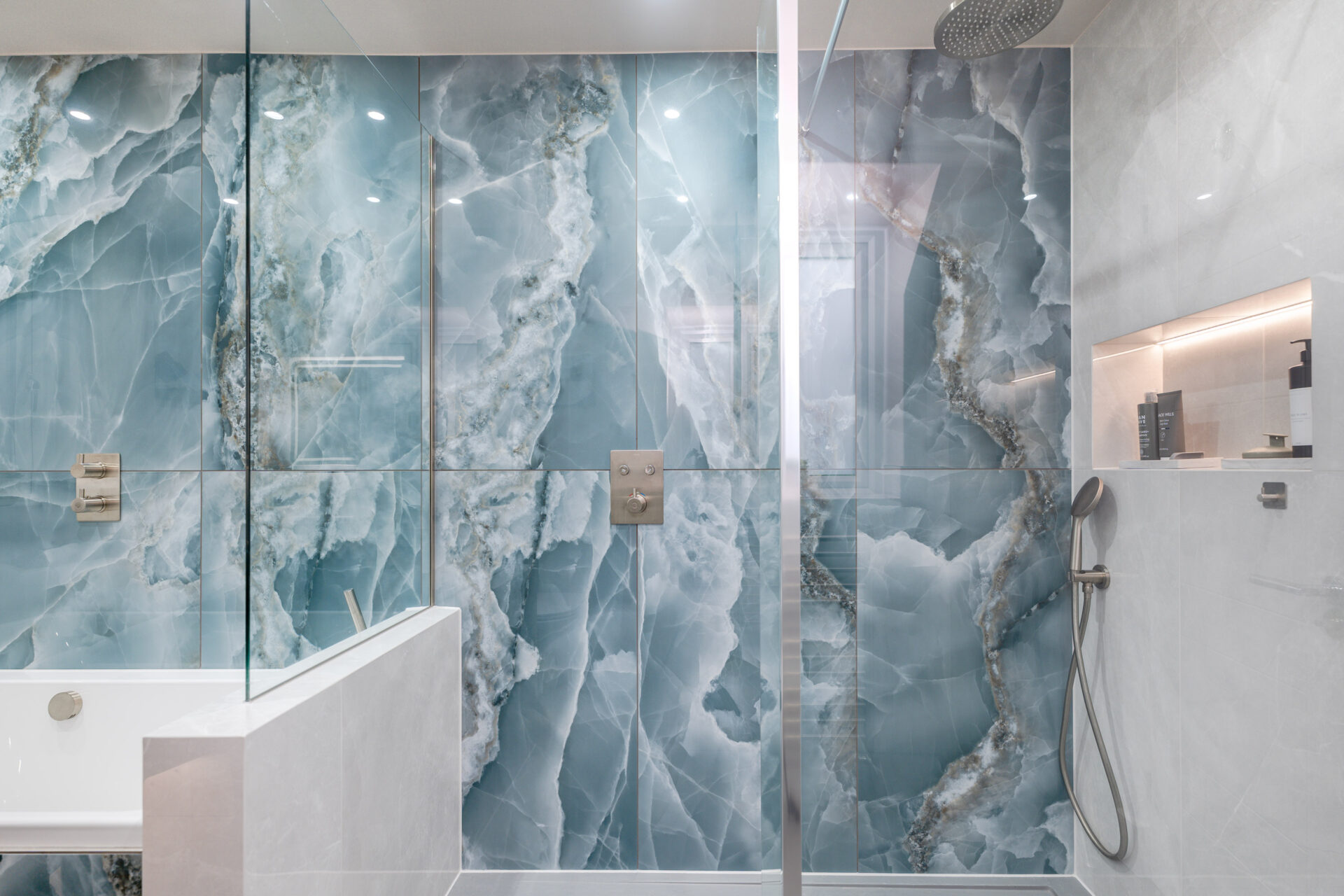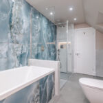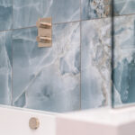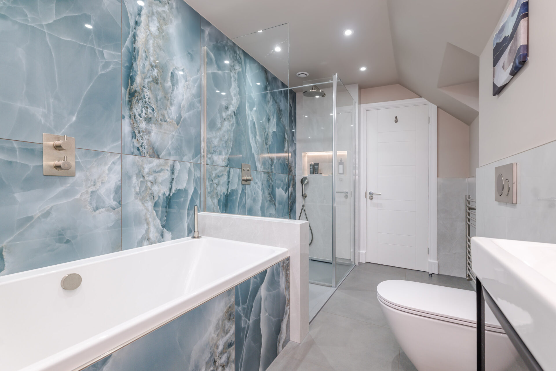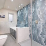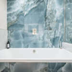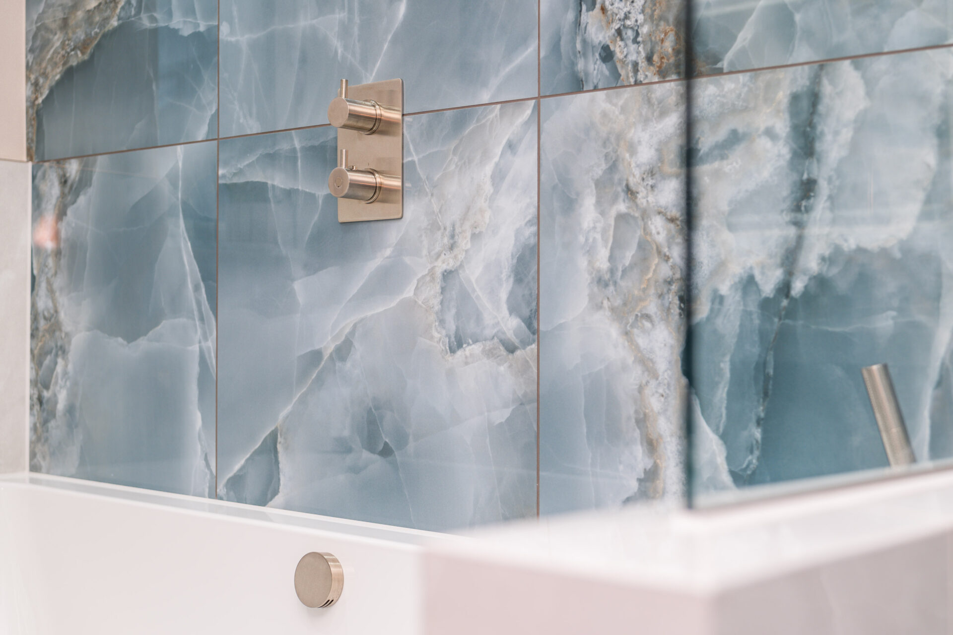 This elegant bathroom in Horsham showcases luxurious blue onyx tiles with dramatic natural veining that flow seamlessly across the shower wall and bath surround. The tiles are finished with a flawless mitred tiled edge, highlighting exceptional craftsmanship and attention to detail. The overall design is strikingly linear, with clean lines and a minimalist layout, creating a modern and timeless atmosphere. Soft neutral tones on the walls and floor complement the rich blue hues, while carefully selected fixtures and fittings enhance the sense of sophistication and luxury.