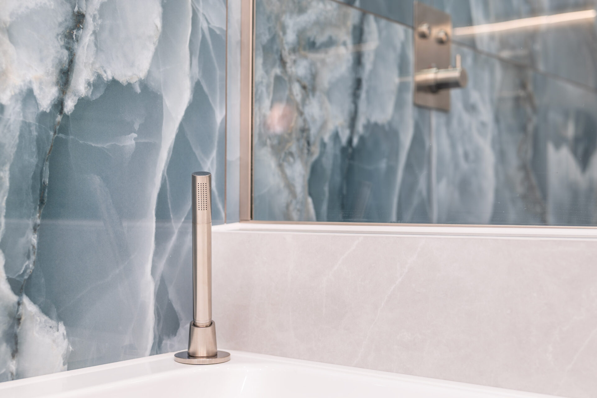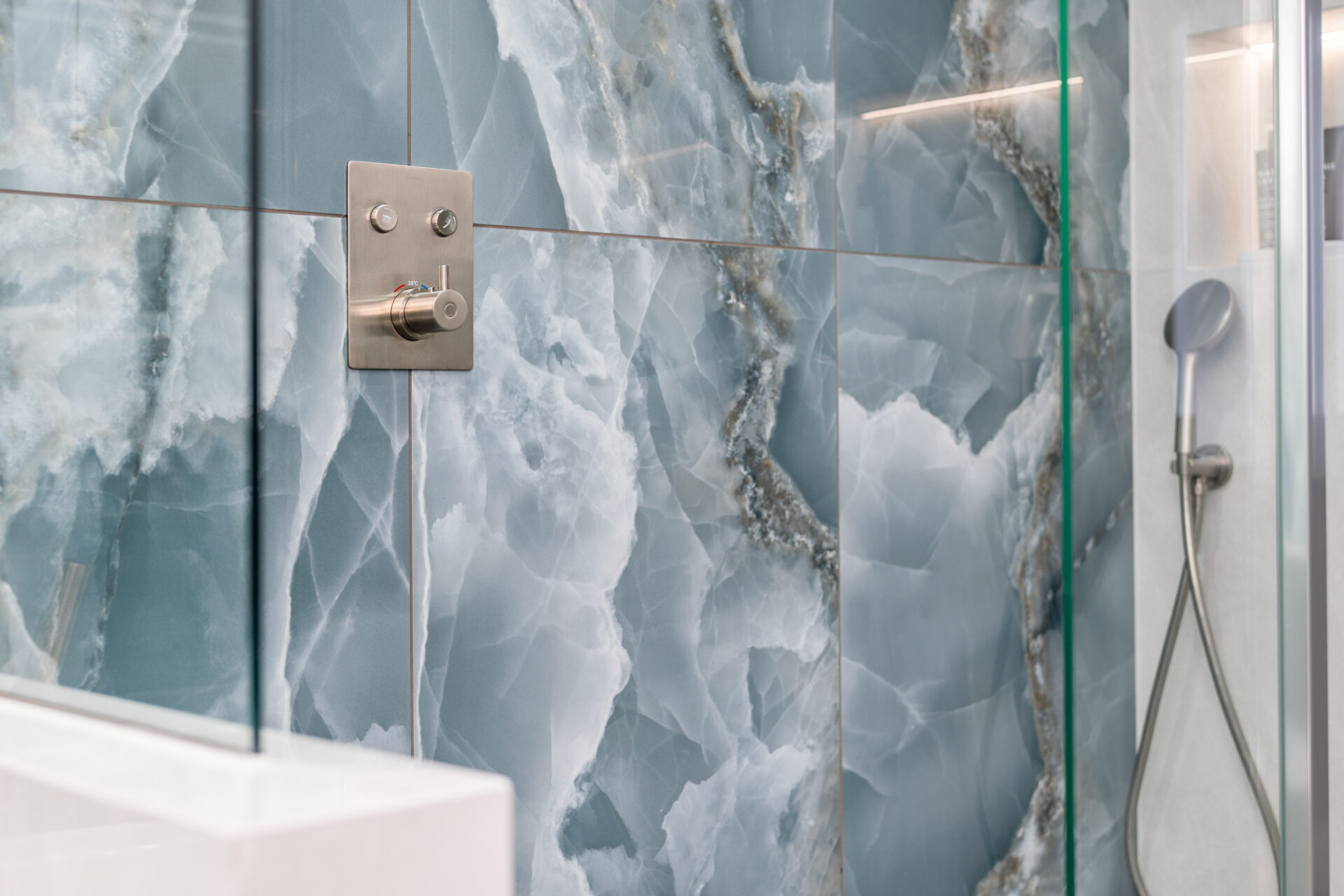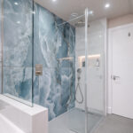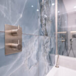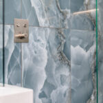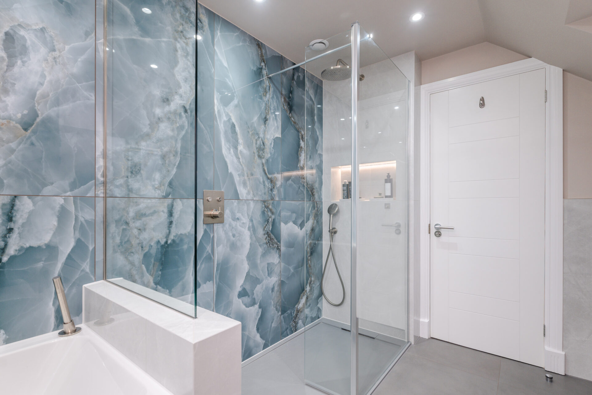 This elegant bathroom in Horsham showcases luxurious blue onyx tiles with dramatic natural veining that flow seamlessly across the shower wall and bath surround. The tiles are finished with a flawless mitred tiled edge, highlighting exceptional craftsmanship and attention to detail. The overall design is strikingly linear, with clean lines and a minimalist layout, creating a modern and timeless atmosphere. Soft neutral tones on the walls and floor complement the rich blue hues, while carefully selected fixtures and fittings enhance the sense of sophistication and luxury.
