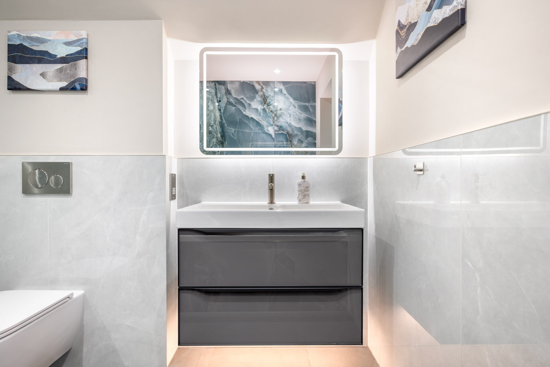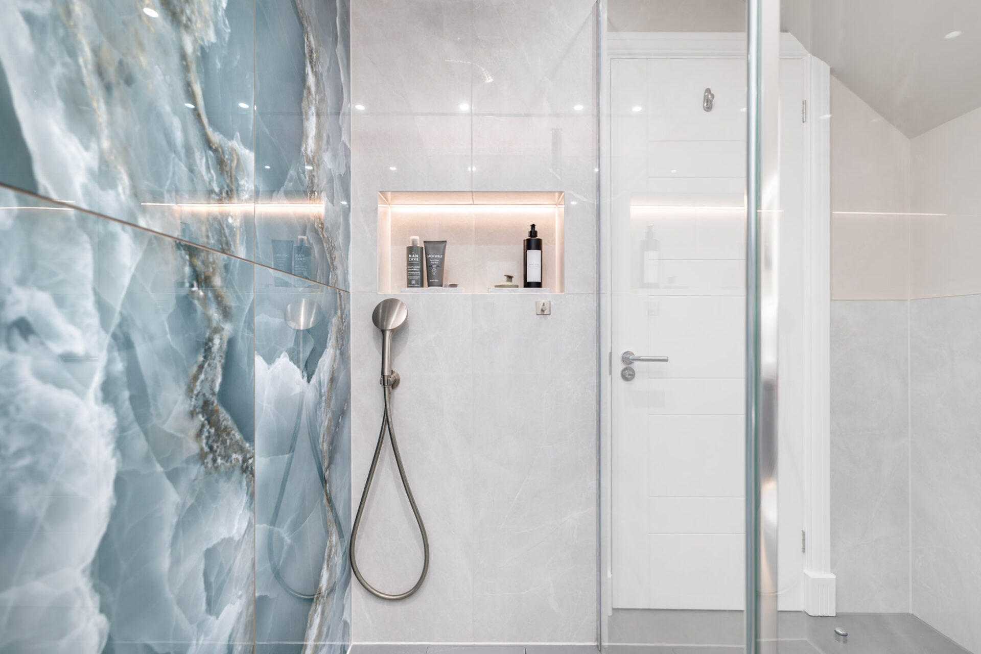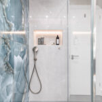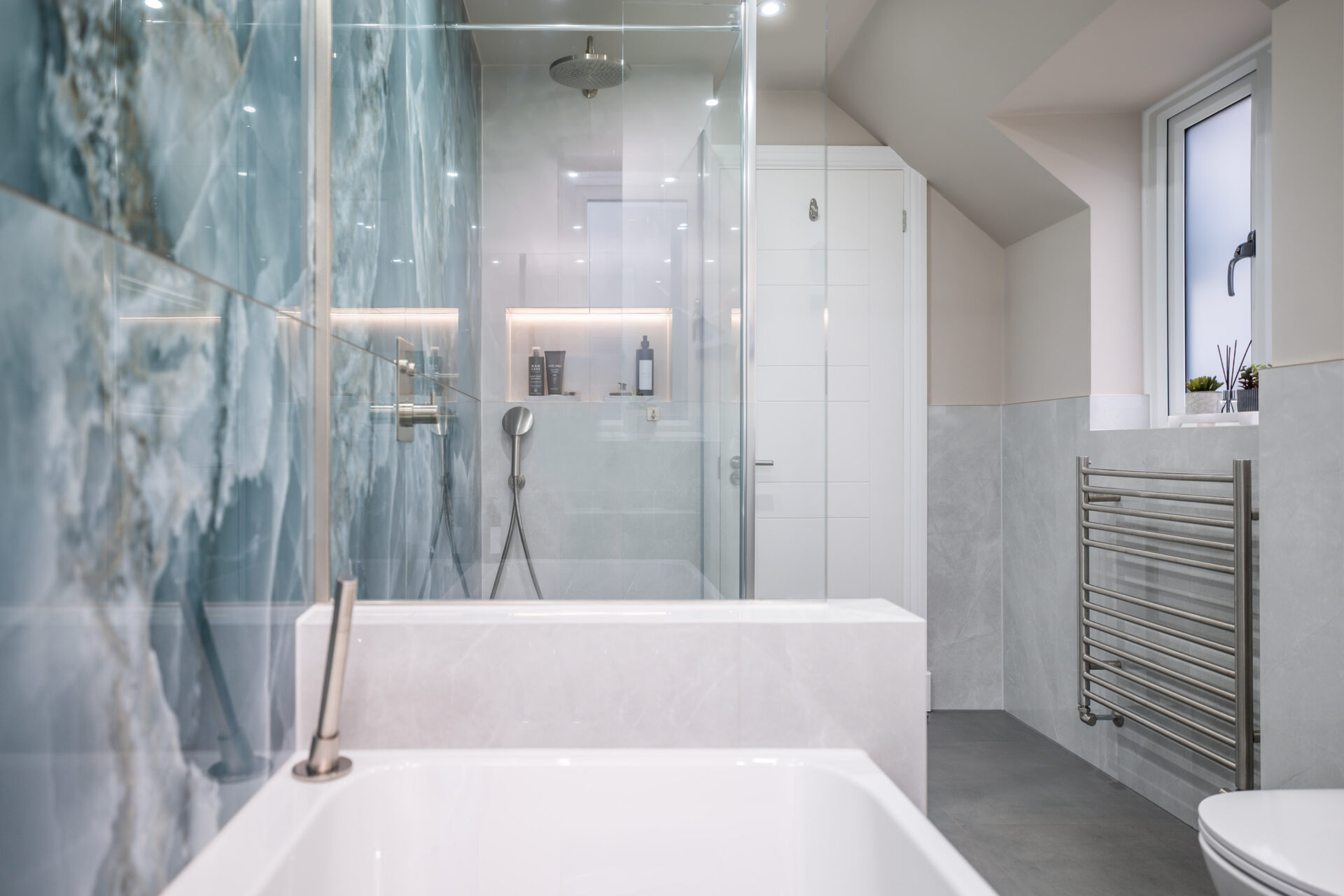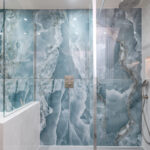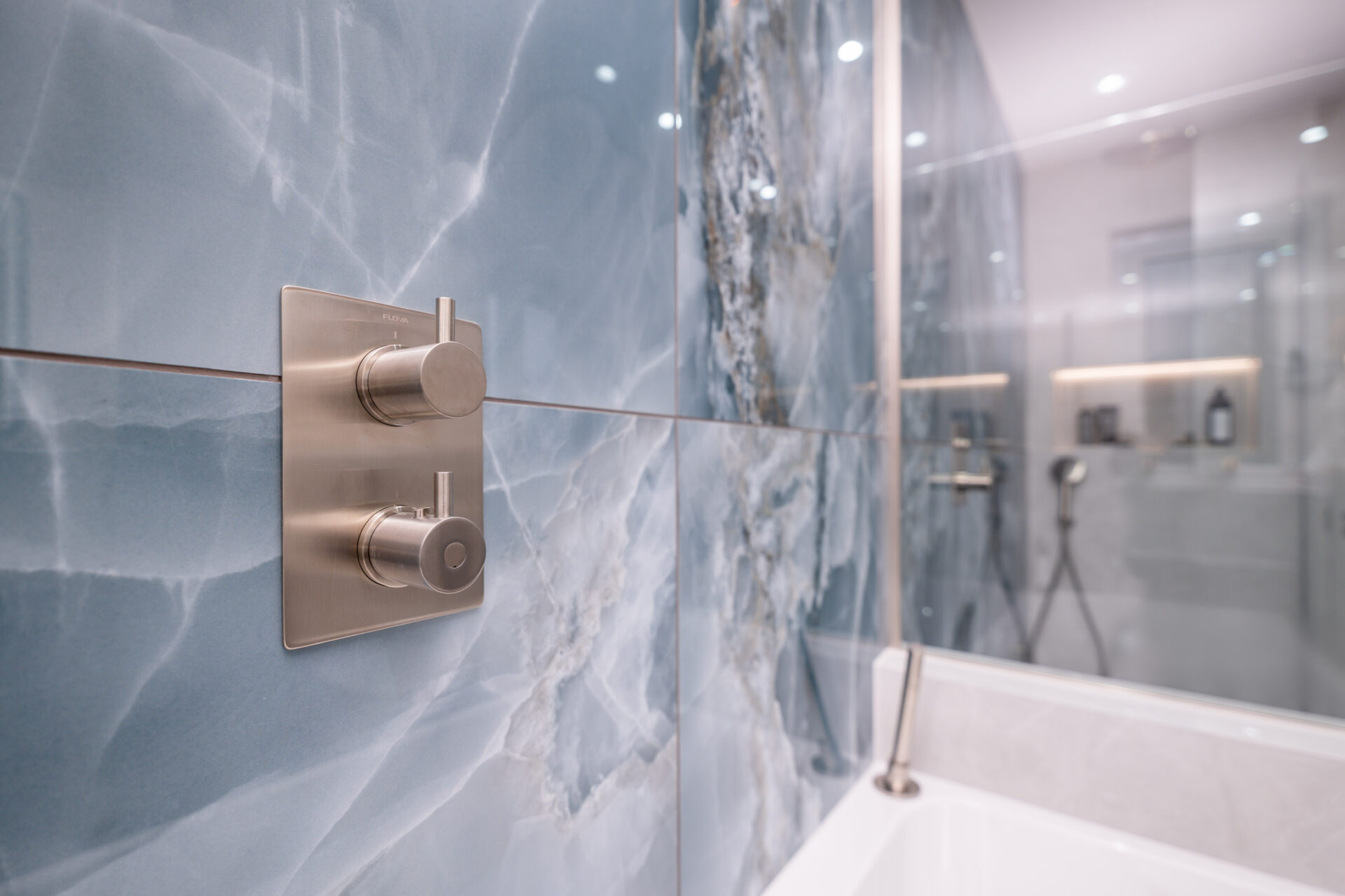 This elegant bathroom in Horsham showcases luxurious blue onyx tiles with dramatic natural veining that flow seamlessly across the shower wall and bath surround. The tiles are finished with a flawless mitred tiled edge, highlighting exceptional craftsmanship and attention to detail. The overall design is strikingly linear, with clean lines and a minimalist layout, creating a modern and timeless atmosphere. Soft neutral tones on the walls and floor complement the rich blue hues, while carefully selected fixtures and fittings enhance the sense of sophistication and luxury.