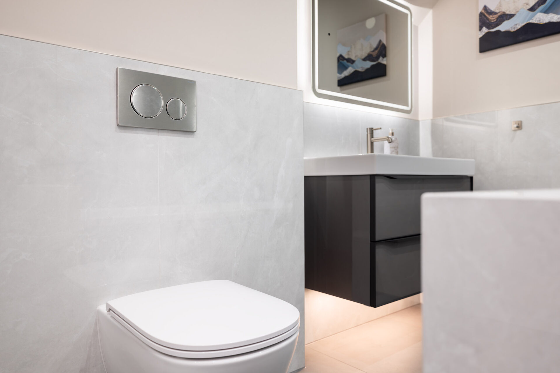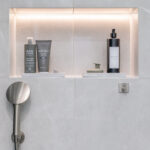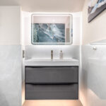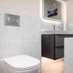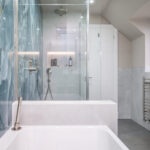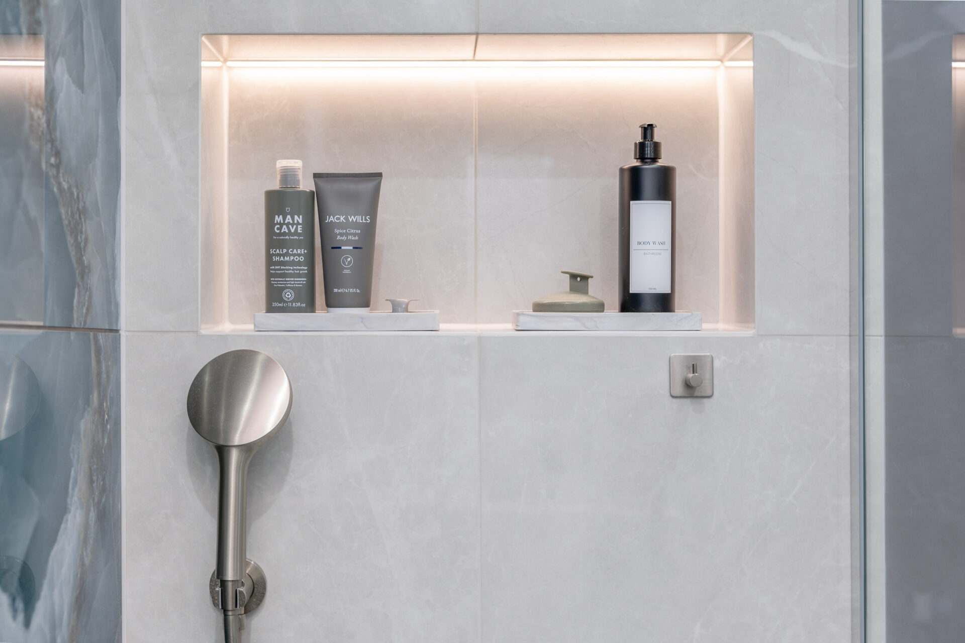 One of the key challenges in creating this space was working with a concrete structure, which required careful planning and expert execution to ensure the surfaces were perfectly level and the tiling installation was flawless. Additionally, the narrow layout demanded innovative design solutions to make both the bath and shower function seamlessly within the confined space without compromising on comfort or style. Through meticulous planning and bespoke detailing, the final result is a highly functional yet luxurious bathroom that maximizes the linear space while showcasing premium materials and refined design.