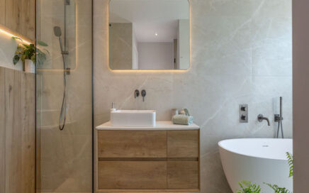 Calm and inviting master bathroom Step into pure sophistication with this stunning contemporary bathroom. Featuring sleek, minimalist fittings and a soft neutral palette, this space perfectly balances luxury with comfort. The matte gold accents, from the heated towel rail to the taps, add a warm touch of opulence without overwhelming the calm atmosphere of these…